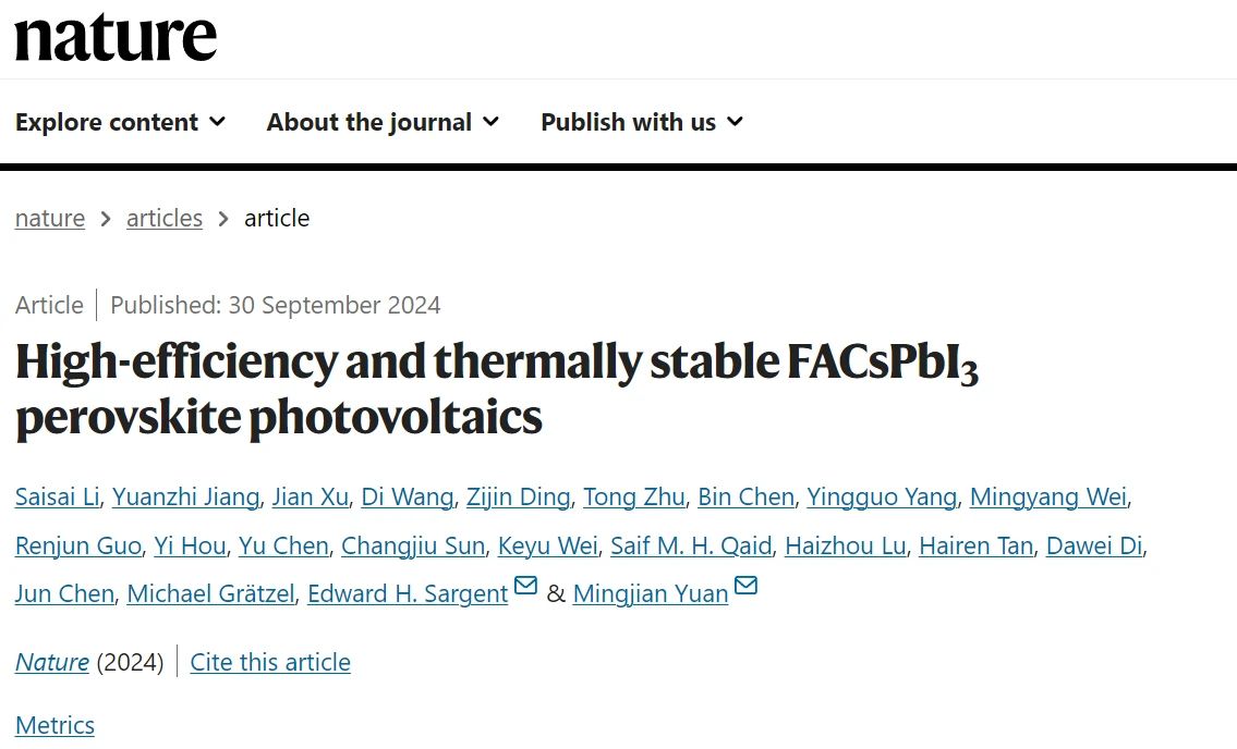 該研究題為“High-efficiency and thermally stable FACsPbI3 perovskite photovoltaics”。團(tuán)隊(duì)針對(duì)鈣鈦礦太陽(yáng)能電池在高溫工況條件下穩(wěn)定性不足這一領(lǐng)域難題進(jìn)行深入研究,首次揭示了合金鈣鈦礦薄膜內(nèi)部復(fù)雜的化學(xué)組分偏析問(wèn)題?;诖?,研究團(tuán)隊(duì)發(fā)展了一種全新的原位結(jié)晶動(dòng)力學(xué)調(diào)控策略,成功制備出了兼具高效率與高工況穩(wěn)定性的鈣鈦礦太陽(yáng)能電池器件。