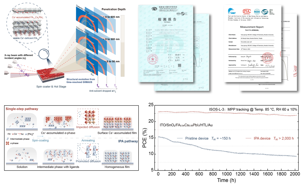 在此基礎(chǔ)上,課題組與合作單位開(kāi)展了深入的理論模擬研究,闡明了該空間組分異質(zhì)性的根本成因。隨后,通過(guò)理性篩選配體化學(xué)結(jié)構(gòu),結(jié)合多維度原位結(jié)晶動(dòng)力學(xué)研究,研究團(tuán)隊(duì)首次提出了具有普適性的結(jié)晶路徑調(diào)控轉(zhuǎn)換策略,最終實(shí)現(xiàn)了高質(zhì)量無(wú)甲銨FACsPbI3鈣鈦礦薄膜可控制備,徹底解決了FACsPbI3鈣鈦礦薄膜的空間組分異質(zhì)性問(wèn)題。利用該策略制備的FACsPbI3鈣鈦礦太陽(yáng)能電池器件,展現(xiàn)出了世界一流的能量轉(zhuǎn)換效率與高溫工況穩(wěn)定性。經(jīng)過(guò)福建國(guó)家光伏產(chǎn)業(yè)計(jì)量中心和中國(guó)科學(xué)院上海微系統(tǒng)與信息技術(shù)研究所的權(quán)威認(rèn)證,該器件的穩(wěn)態(tài)能量轉(zhuǎn)換效率達(dá)到了目前正式鈣鈦礦太陽(yáng)能電池的最高水平。