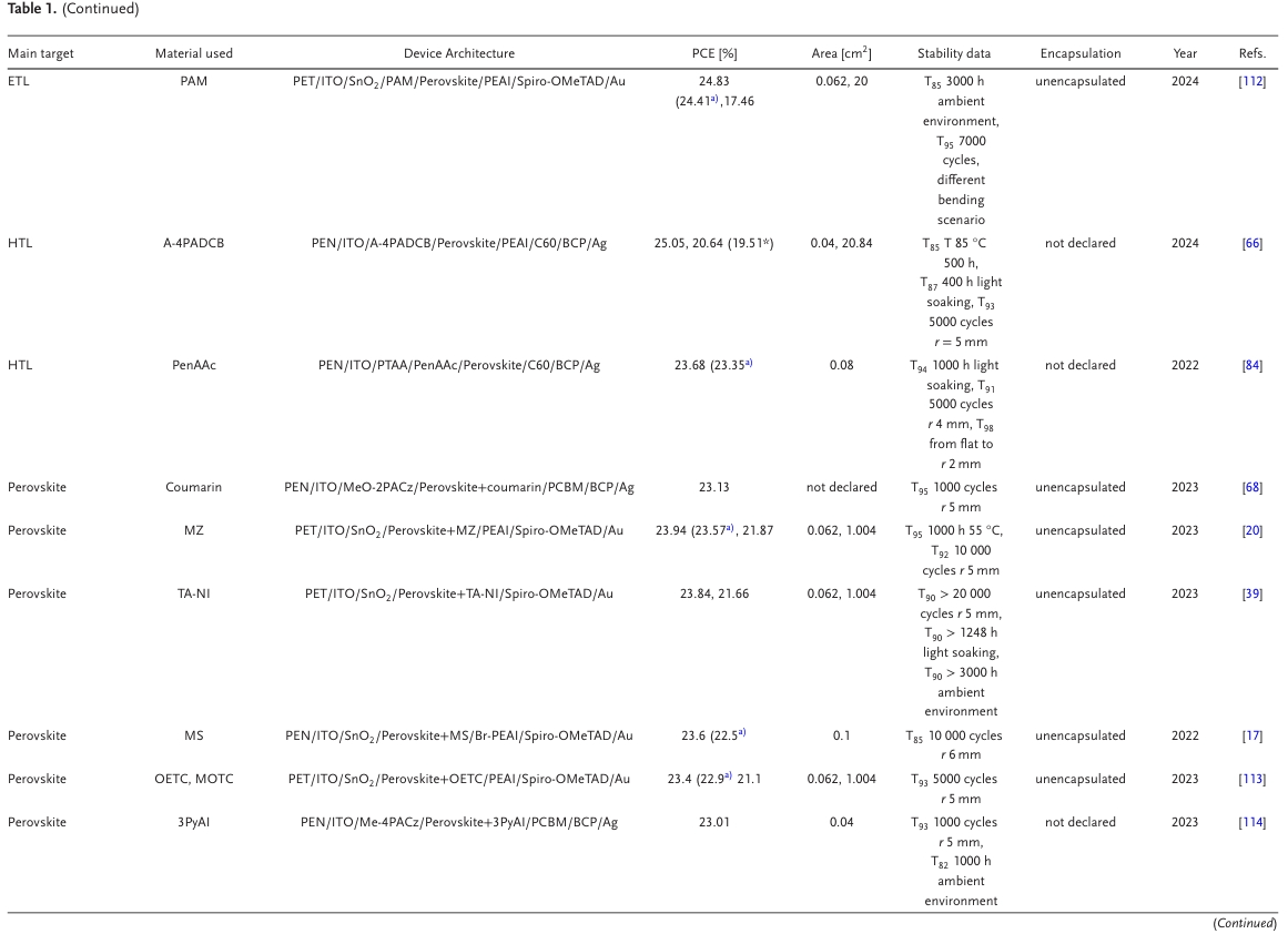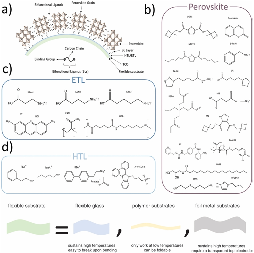 圖1. 在鈣鈦礦墨水中引入雙功能添加劑的機制,通過避免柔性鈣鈦礦太陽能技術(shù)彎曲和扭曲過程中活性層薄膜的分層和開裂問題,引入強結(jié)合基團的短雙官能團來改善晶界鈍化和界面增韌;針對ETL、HTL和鈣鈦礦層的柔性鈣鈦礦太陽能電池(f-PSCs)功率轉(zhuǎn)換效率(PCE)>23%的材料總結(jié)。
