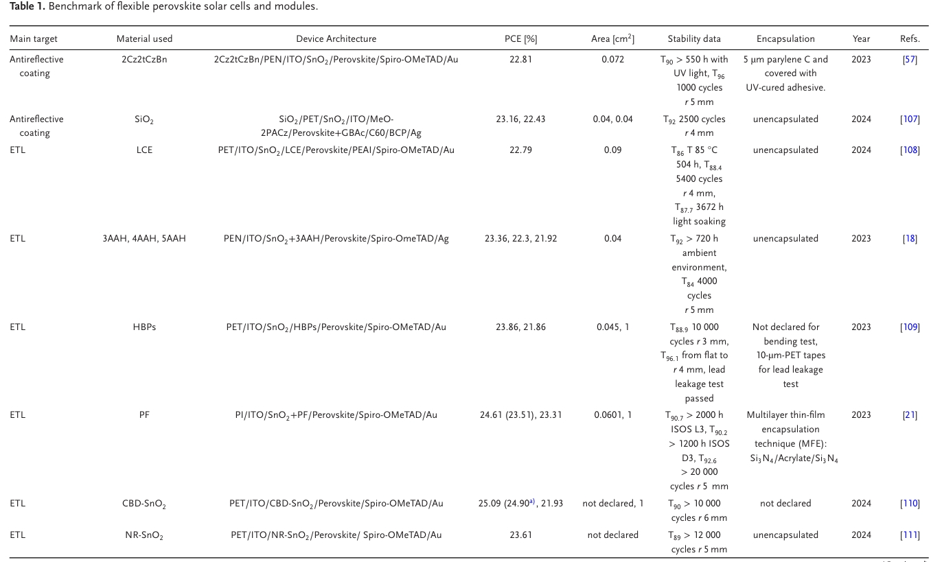 此外,本綜述還對最新的穩(wěn)定性測試程序進行了深入的研究,包括機械穩(wěn)定性測試和為柔性模塊量身定制的封裝策略,這對于市場的采用至關(guān)重要,但往往被忽視。它涵蓋了在柔性襯底上的鈣鈦礦太陽能電池和模塊的進展、挑戰(zhàn)和進展。它深入研究了材料、化學(xué)作用和制備過程,強調(diào)了在大面積襯底上均勻沉積的必要性。還討論了穩(wěn)定性、封裝性和商業(yè)化前景,對該領(lǐng)域進行了全面的概述。