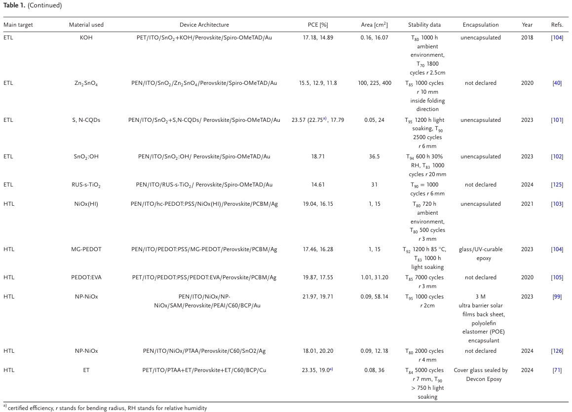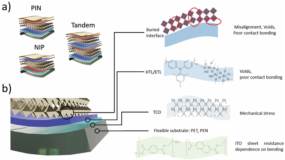 圖2. a) 用于柔性鈣鈦礦太陽能技術(shù)的器件結(jié)構(gòu):PIN,NIP和疊層器件結(jié)構(gòu)。b) 重點研究的主要問題是解決限制剛性和柔性襯底之間的差距:柔性襯底的選擇,柔性襯底和TCO之間的接觸,其中ITO的方塊電阻通過襯底彎曲來改變;TCO與HTL ETL之間的接觸,主要問題集中在孔洞的存在以及這些層之間的接觸結(jié)合較差;HTL/ETL與鈣鈦礦之間的接觸(埋底界面),鈣鈦礦層可能會錯位,產(chǎn)生孔洞,并且在HTL / ETL下面的HTL / ETL中具有較差的接觸結(jié)合。