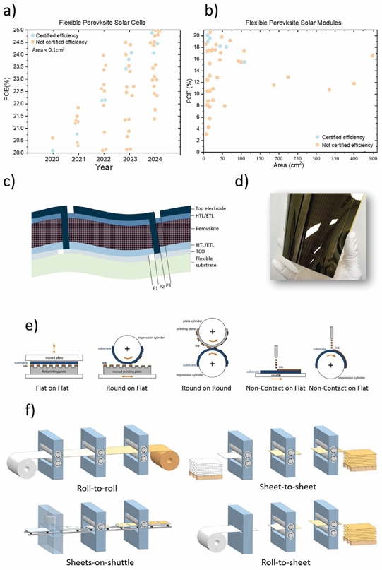 在這篇綜述中,作者更深入地探討了向柔性基底過渡時面臨的具體挑戰(zhàn),包括在各種環(huán)境條件下出現(xiàn)的機械和化學(xué)穩(wěn)定性問題,強調(diào)了對商業(yè)可行性至關(guān)重要的升級過程。作者重點關(guān)注電池的串聯(lián)以減輕電阻率的影響,以及對柔性襯底的激光刻蝕技術(shù)(P1、P2、P3)的優(yōu)化,這是在更大尺度上保持性能的一個重要方面。