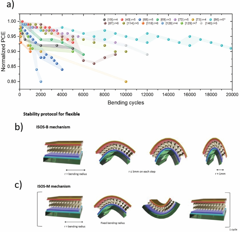 圖4. a)總結(jié)了截至202 419年11月,在研究領(lǐng)域中對柔性鈣鈦礦技術(shù)所取得的最佳結(jié)果進行的力學(xué)測試,r代表以mm測量的彎曲半徑,進行彎曲試驗,愈合步驟為1小時,每2000次循環(huán);b) 提出了標(biāo)準的ISOS-M機制,展示了一個力學(xué)測試周期,使柔性裝置從平面轉(zhuǎn)到固定彎曲位置,適用于凸起和凹陷兩種工況;c) 提出了標(biāo)準的ISOS-B機制,使柔性器件從平面上升到1 mm的彎曲半徑。