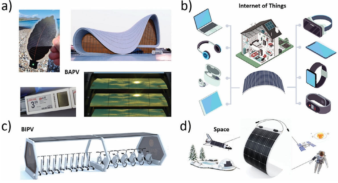 圖6. 柔性鈣鈦礦太陽能技術(shù)的商業(yè)應(yīng)用:a) 建筑應(yīng)用光伏應(yīng)用(BAPV),具有自由的形態(tài)設(shè)計,可適應(yīng)任何建筑,市場上有2種產(chǎn)品可供使用,如基于鈣鈦礦的電子貨架標(biāo)簽(PESL)和遮光板。源:Saule Technologies b) 物聯(lián)網(wǎng)應(yīng)用,具有潛在的使用基于鈣鈦礦的柔性光伏作為替代品或為電池技術(shù)供電的便攜式設(shè)備存在于住宅和個人使用中,如智能手機,智能手表和智能帶,便攜式筆記本電腦,無線耳機和虛擬現(xiàn)實googles。源:IDTechEx研究;c) 建筑集成光伏(BIPV),通過在建筑中集成柔性太陽能產(chǎn)品和特定的裝置,從窗戶和立面收集能量,為電動車、代步車和共享單車供電,例如一個汽車港口站;資料來源:Saule Technologies;d) 適用于空間和極地環(huán)境的柔性太陽能技術(shù),因為其具有最低的功率重量比和較好的低溫性能。