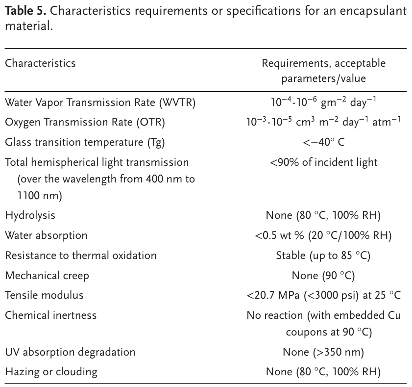 7. 封裝作者認為封裝是保證太陽能電池壽命、效率和安全性的關(guān)鍵步驟,特別是隨著對柔性襯底太陽能電池的關(guān)注越來越多。柔性模組需要封裝材料在保持柔韌性的同時,對水分、氧氣和機械應(yīng)力提供堅固的保護。相比之下,剛性模組使用封裝材料,如乙烯-醋酸乙烯酯(EVA),它提供了優(yōu)異的保護,但缺乏靈活性。對于柔性模組,薄膜封裝、柔性層壓等先進的封裝方法必不可少。柔性鈣鈦礦模塊的封裝通常使用柔性聚合物(例如,聚烯烴、聚氨酯等)和多層阻擋層薄膜等材料。這些材料必須提供低的水蒸氣透過率(WVTR)和氧氣透過率(OTR)來保護敏感的鈣鈦礦層。例如,聚烯烴等柔性封裝材料可以提供低至0.01 g / m2/day的WVTR值,這對于保持器件性能和穩(wěn)定性至關(guān)重要。在柔性PSC生產(chǎn)中常見的卷對卷工藝,需要在很長的長度上均勻地沉積封裝層,以實現(xiàn)一致的保護。高性能的阻隔膜對長期穩(wěn)定性至關(guān)重要,水蒸氣和氧氣透過率(WVTRs和OTRs)是關(guān)鍵指標(biāo)。鈣鈦礦太陽能技術(shù)要求WVTR或OTR的阻隔性能反映了這些器件對水分和氧氣(表5 ,圖5a)的敏感性。實現(xiàn)如此嚴苛的阻隔性能對阻隔薄膜的初始制備和批量生產(chǎn)都提出了挑戰(zhàn)。表5. 封裝材料的特性要求或規(guī)范。