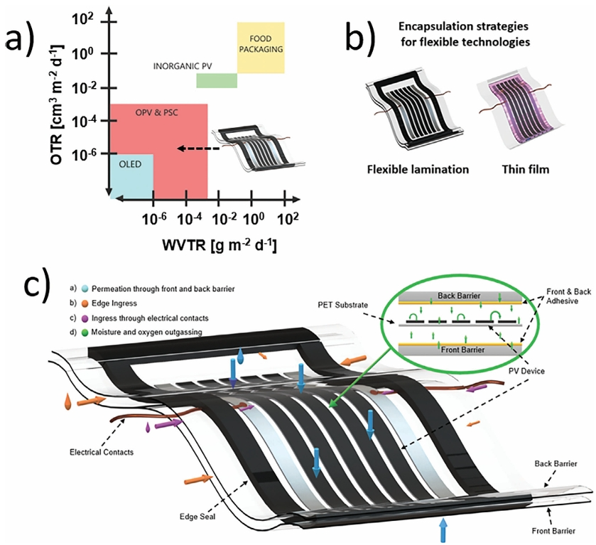 圖5. a) 不同技術(shù)對封裝保護的阻隔性能需求;b) 兩種不同的柔性光伏器件封裝技術(shù)示意圖,顯示柔性層壓和薄膜封裝;c) 闡明了四種不同的水分和氧氣滲透和進入柔性封裝鈣鈦礦器件的途徑,這可能導(dǎo)致加速的器件退化和縮短的壽命。