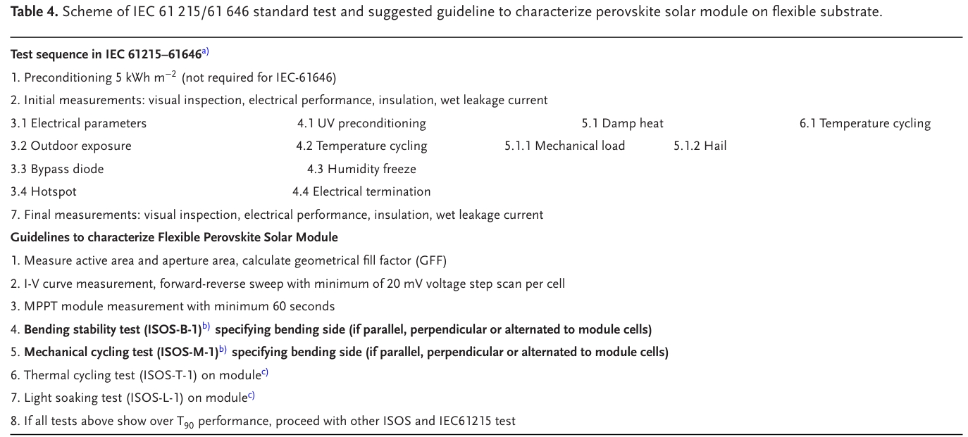 表4. IEC 61 215 / 61 646標(biāo)準測試的方案和建議的指南,以表征柔性襯底上的鈣鈦礦太陽能組件
