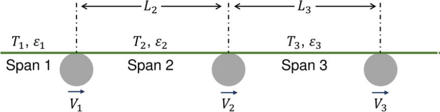 圖2 多跨段卷對(duì)卷(R2R)生產(chǎn)線中的應(yīng)變傳輸(Ti和εi分別表示第i個(gè)卷材跨段的卷材張力和應(yīng)變,Vi表示第i個(gè)跨段末端的卷材縱向速度,Li表示第i個(gè)跨段的長度,其中i=1–3)02