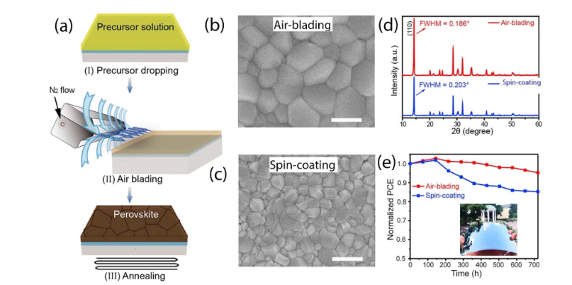 圖 1(a)氣刀輔助法沉積鈣鈦礦薄膜的示意圖。(b)和(c)分別是用氣刀(b)和旋涂(c)法沉積的鈣鈦礦MAPbI3薄膜的俯視掃描電子顯微鏡(SEM)圖像,展示了晶粒結(jié)構(gòu)的差異。(d)MAPBI薄膜的 X 射線衍射(XRD)圖譜,突出了氣刀技術(shù)對結(jié)晶度的改善。(e)用每種方法制備的太陽能電池的穩(wěn)定性比較;插圖展示了一個 15 cm×15 cm 的鈣鈦礦模塊。