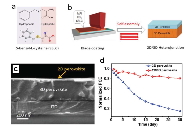 圖3 S-芐基-L-半胱氨酸(SBLC)分子結(jié)構(gòu)(a);2D/3D鈣鈦礦薄膜刮刀涂布示意圖(b);2D/3D鈣鈦礦薄膜的掃描電鏡(SEM)表面圖像(c);3D 和 2D/3D異質(zhì)結(jié)構(gòu)太陽能電池在相對濕度(RH)為50%±10%的環(huán)境空氣中儲存時的貨架穩(wěn)定性(d)