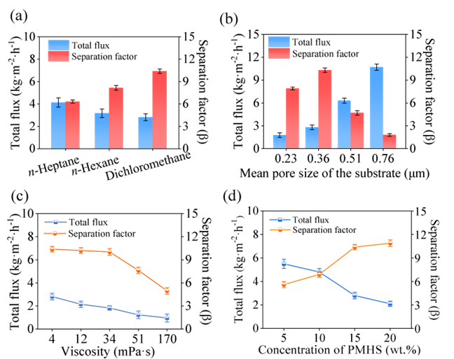圖2. 采用不同(a)溶劑、(b)基底孔徑、(c)vinyl-PDMS粘度和(d)PMHS濃度制備的vinyl-PDMS復(fù)合膜的滲透汽化性能