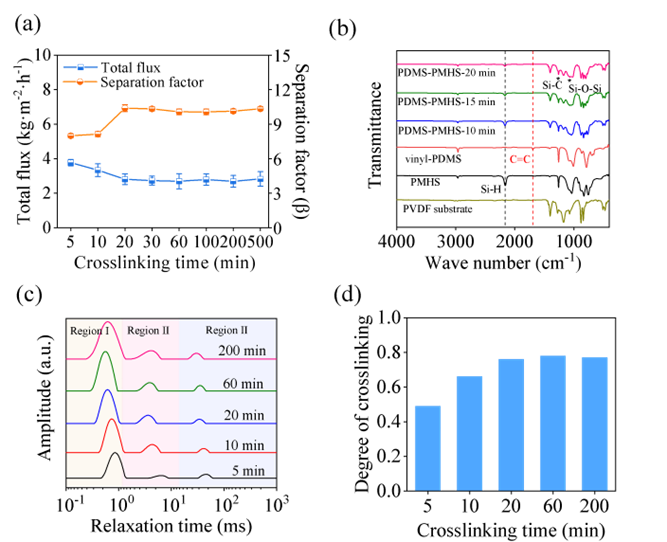 圖3. 不同交聯(lián)時間制備的vinyl-PDMS復(fù)合膜的(a)滲透汽化性能,(b)傅里葉變換紅外光譜圖,(c)1H低場核磁共振譜圖,以及(d)交聯(lián)度