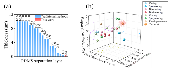 圖4. 文獻(xiàn)中不同制備方法制備的乙烯基-PDMS復(fù)合膜的(a)厚度比較,以及(b)滲透汽化性能和制備時間的比較